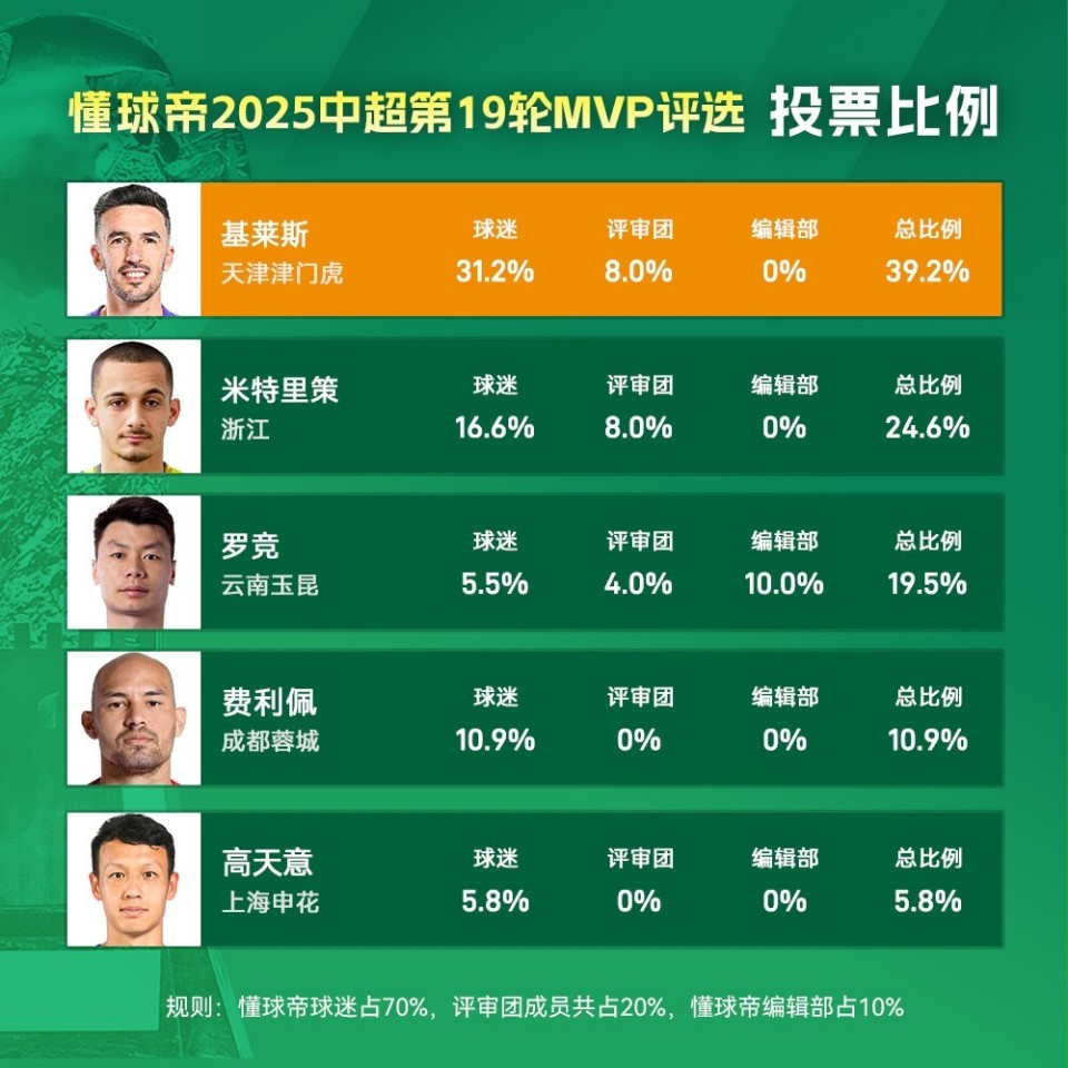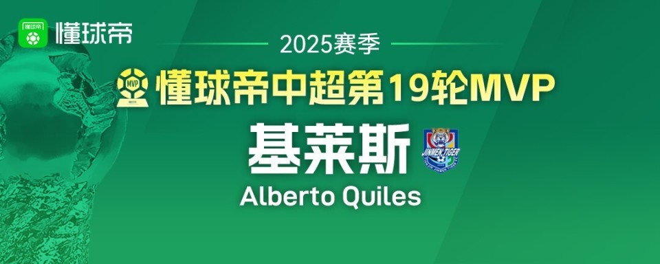 大家好,欢迎来到懂球帝2025赛季中超MVP评选现场。2025赛季中超第19轮MVP得主出炉,天津津门虎外援基莱斯凭借对北京国安梅开二度的精彩表现,力压米特里策和罗竞当选本轮中超的MVP。这也是在第1轮和第4轮后,基莱斯本赛季第3次当选中超MVP!