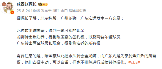 广东转出两名球员和现金,得到焦泊乔的所有权。